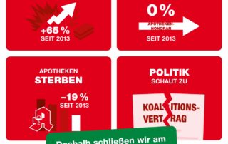 admin2026-03-13T15:33:41+01:00Am 23. März 2026 bleibt unsere Apotheke geschlossen.An diesem Tag gehen wir gemeinsam mit vielen Kolleginnen und Kollegen nach Berlin, um auf die schwierige Situation der Apotheken aufmerksam zu machen. Die Kosten für den Apothekenbetrieb sind in den letzten Jahren stark gestiegen – das Honorar für unsere Arbeit ist jedoch seit 2013 unverändert geblieben. Gleichzeitig müssen immer mehr Apotheken schließen. Wir protestieren, weil eine wohnortnahe und sichere Arzneimittelversorgung für alle Menschen wichtig ist. Ab 24.03.2026 sind wir selbstverständlich wieder [...]